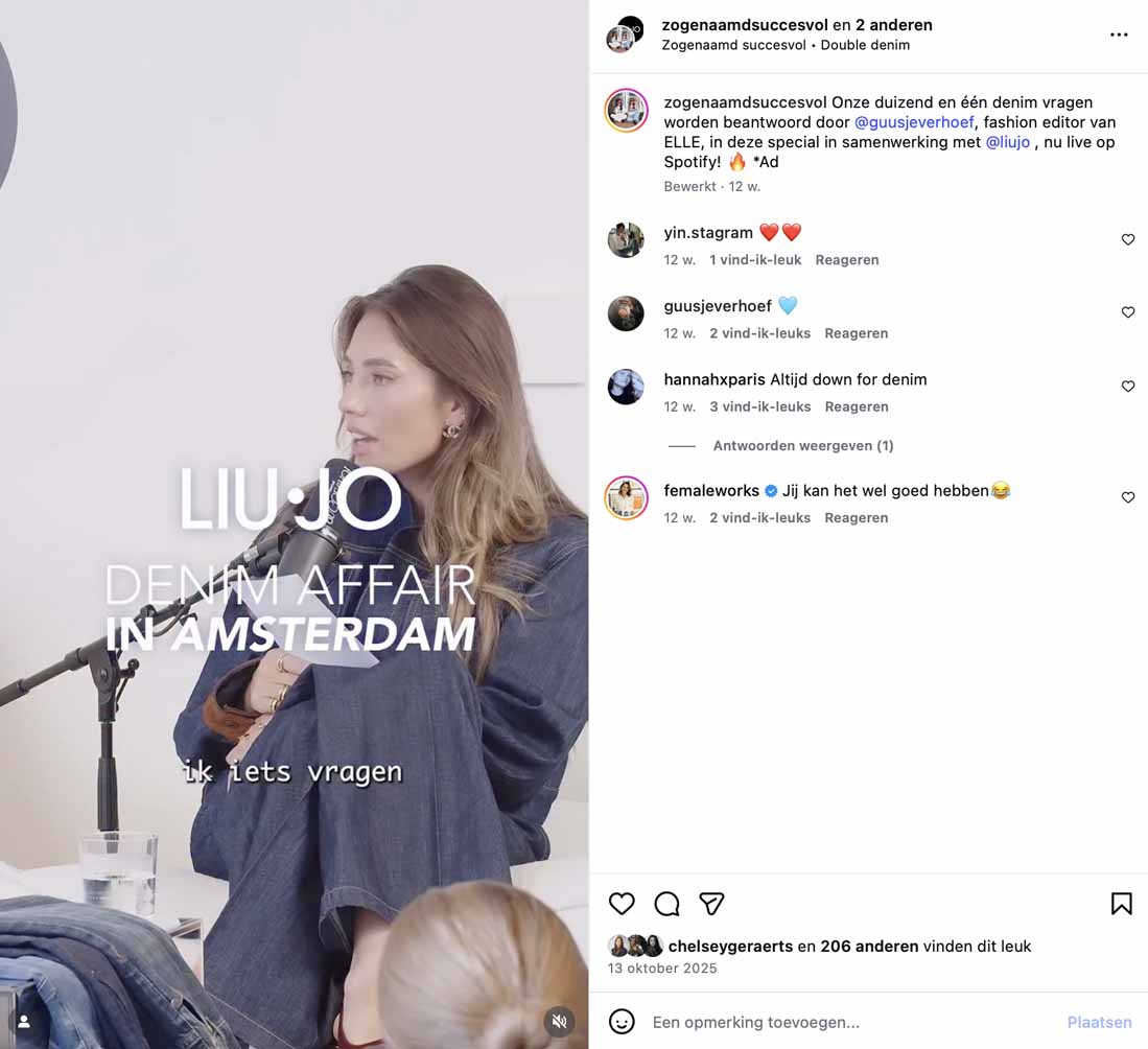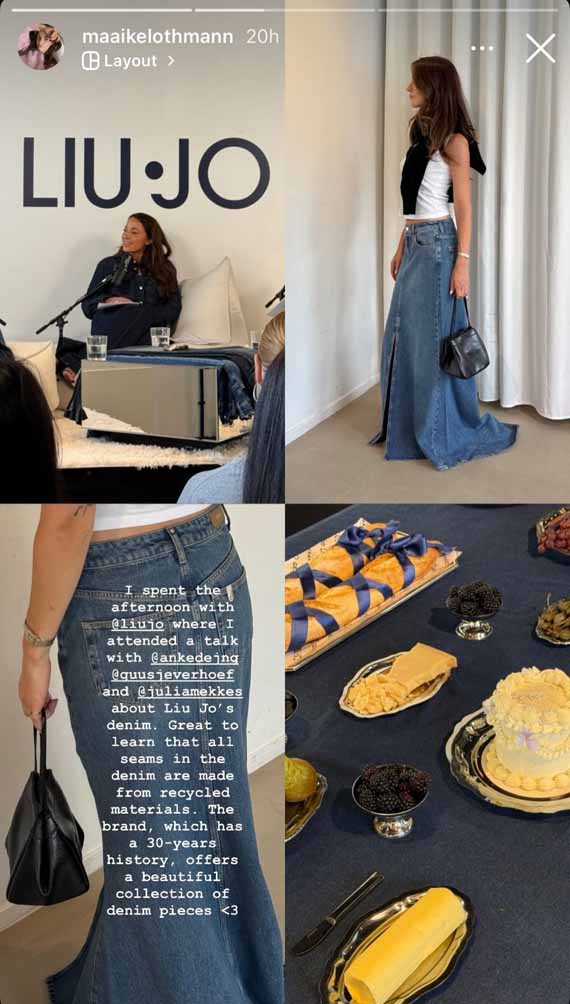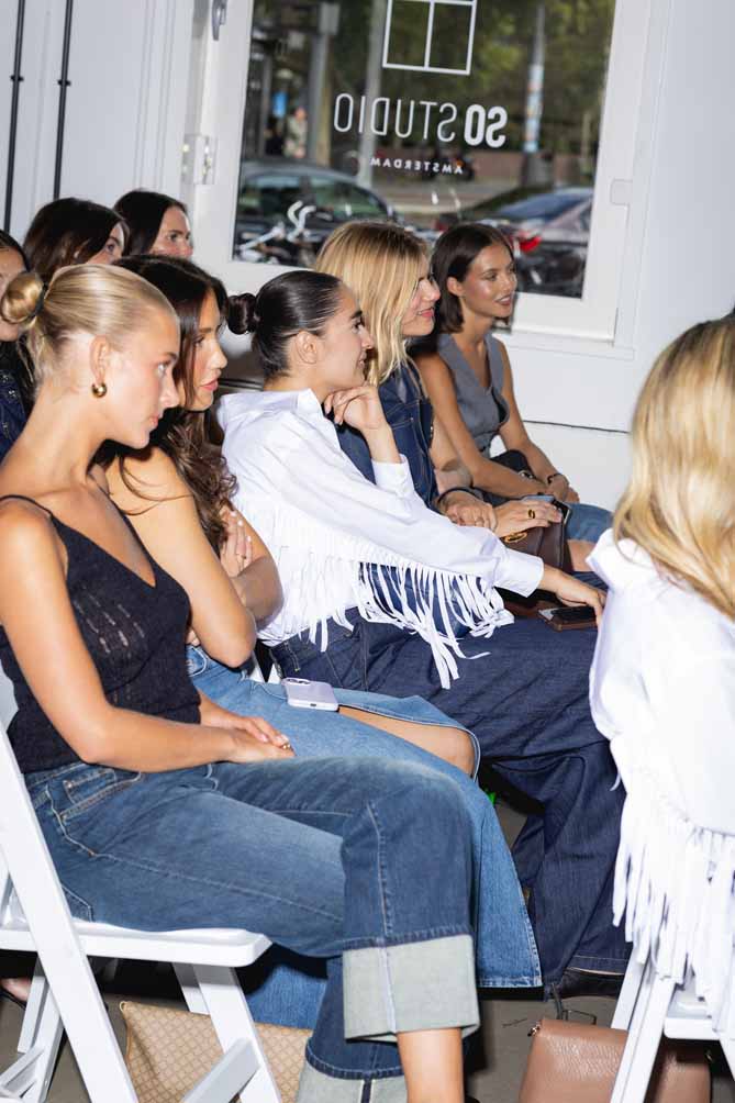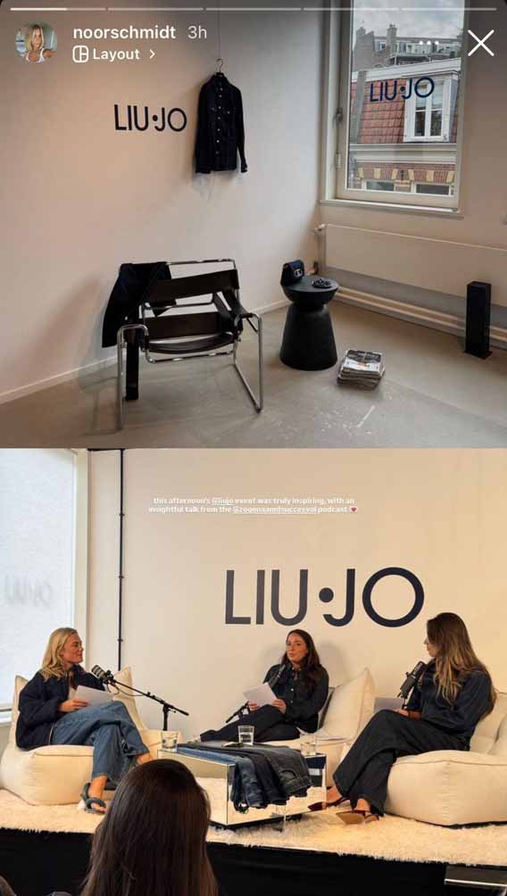 The heart of the event was a live podcast recording of Zogenaamd Succesvol, featuring powerhouse trio Julia Mekkes, Anke de Jong and Guusje Verhoef. Guests were invited to listen in as the conversation explored themes of uniqueness, optimism, female empowerment and, of course, everything denim for the occasion. Once the microphones turned off, the energy shifted from listening to creating. Together with Damon Rigter (Studio Nomadi), creators styled and captured content featuring the new Liu Jo denim collection. From long denim skirts to statement jeans, every look reflected the wearer’s personal style.